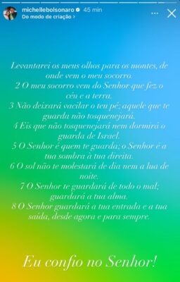 O versículo escolhido faz parte do Salmo 121 e diz: “Levantarei os meus olhos para os montes, de onde vem o meu socorro". A citação foi usada por Michelle como demonstração pública de fé em meio ao momento.