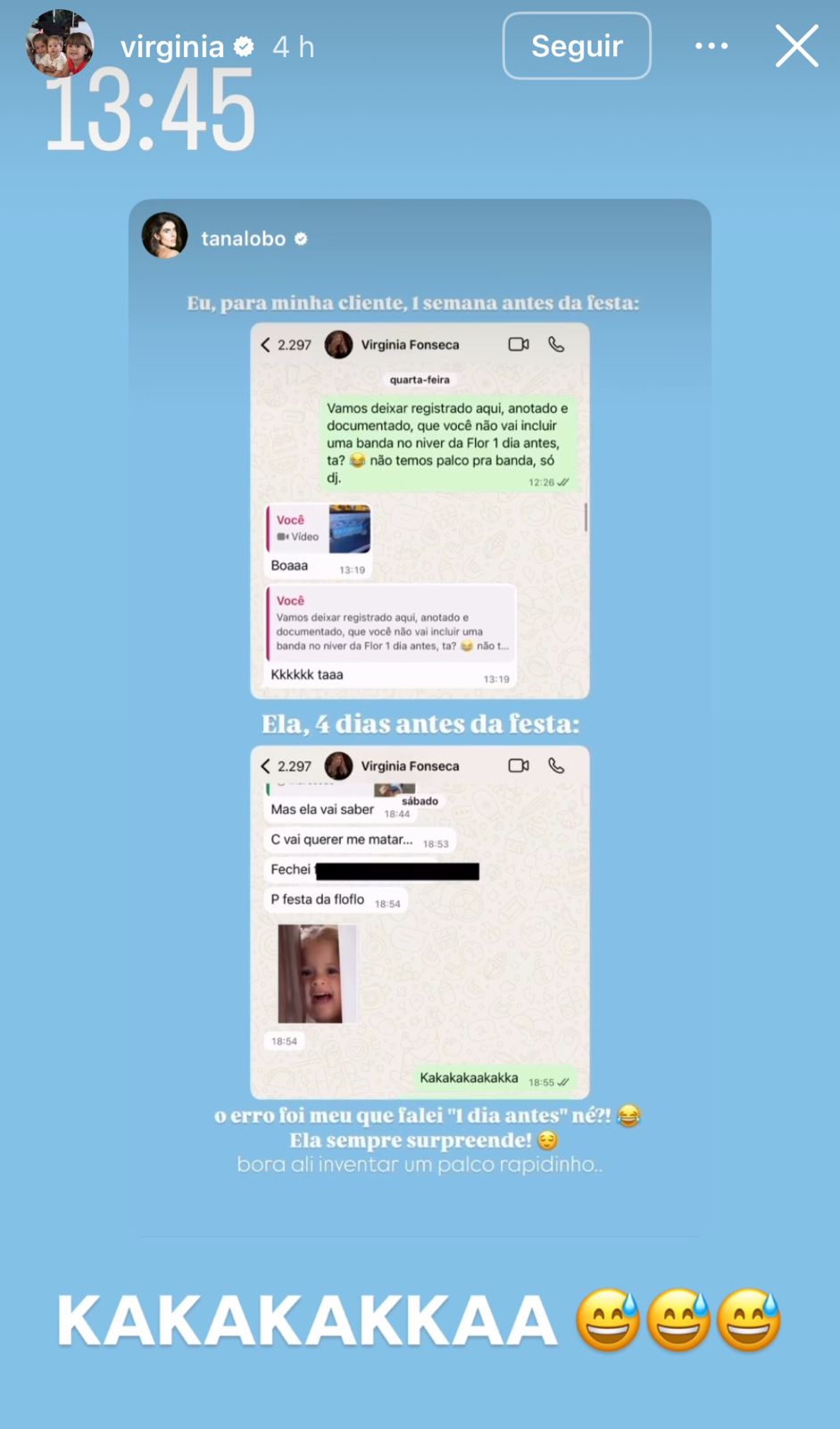 Virginia expôs mensagens trocadas com a organizadora do evento nas quais ela faz um pedido de última hora: a inclusão de uma atração musical. Nos prints divulgados pela mãe de Maria Flor, a profissional havia avisado: