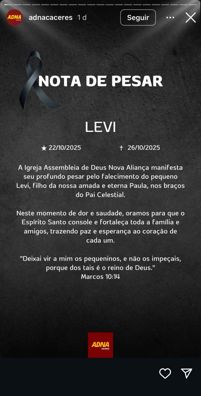 "A ADNA manifesta seu profundo pesar pelo falecimento do pequeno Levi, filho da nossa amada e eterna Paula, nos braços do Pai Celestial. Neste momento de dor e saudade, oramos para que o Espírito Santo console e fortaleça toda a família e amigos, trazendo paz e esperança ao coração de cada um", diz o comunicado.