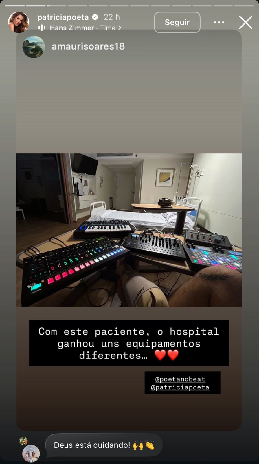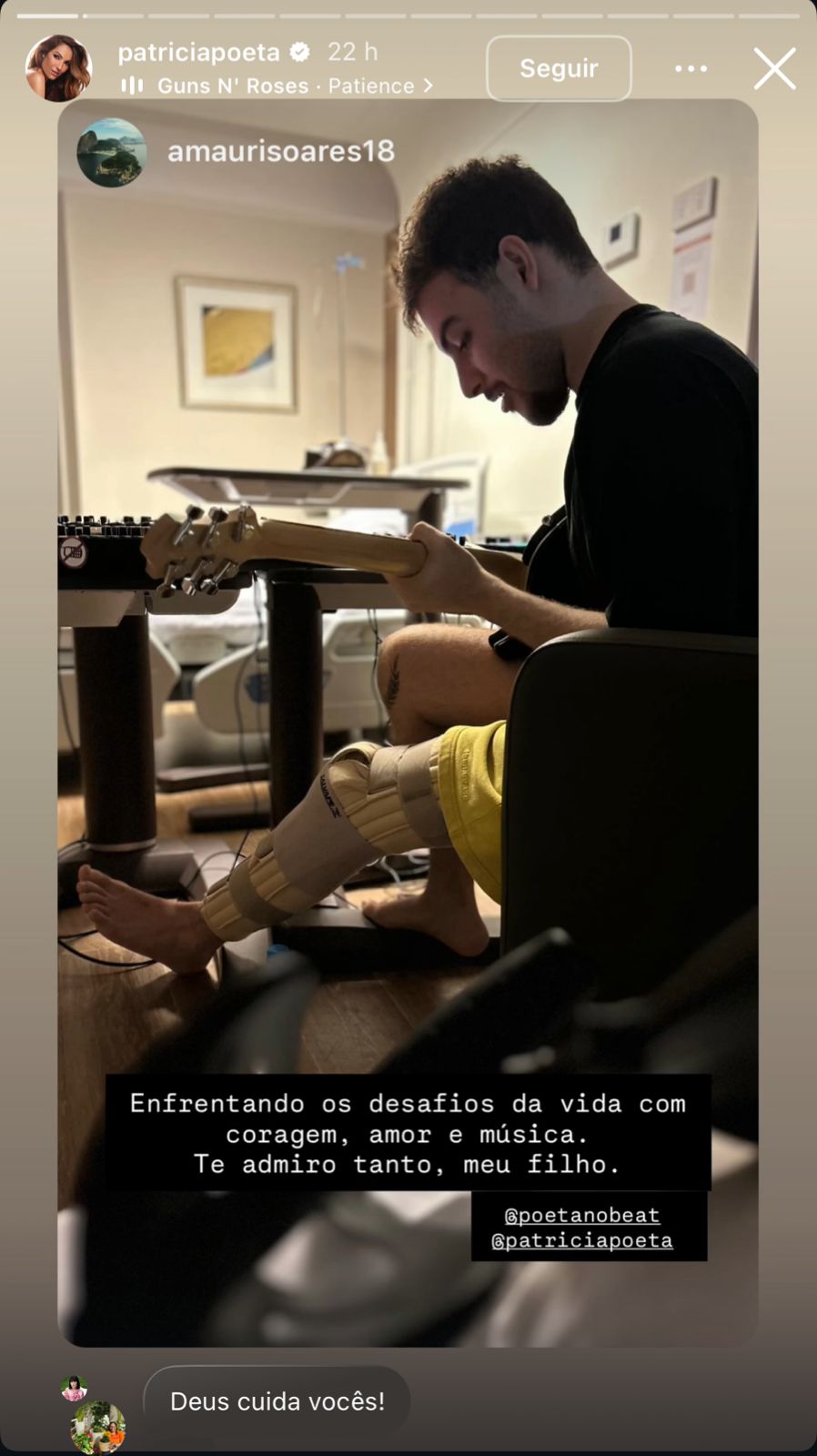 O jovem de 23 anos aparece com a perna imobilizada sentado em uma poltrona ao lado da cama do hospital, tocando guitarra. As imagens foram publicadas nos stories do ex-marido de Patrícia e pai de Felipe, Amauri Soares, e republicadas pela apresentadora.