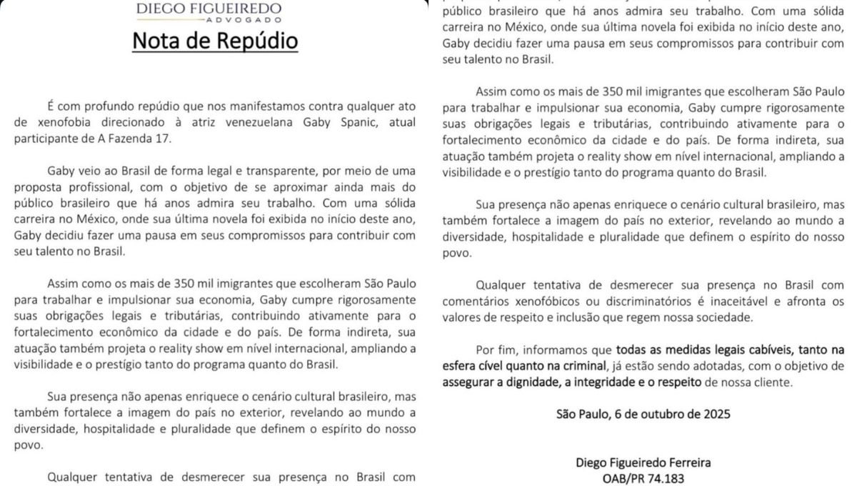Em nota, o advogado destacou: "Nós, da equipe jurídica de @gabyspanictv, juntamente com seu empresário/manager @andrekostta e RP @quique_yeye, repudiamos veementemente qualquer ataque xenofóbico direcionado à atriz. Ao longo de sua trajetória, Gaby sempre enalteceu o nome do Brasil no exterior, levando nossa cultura, alegria e talento para o mundo".