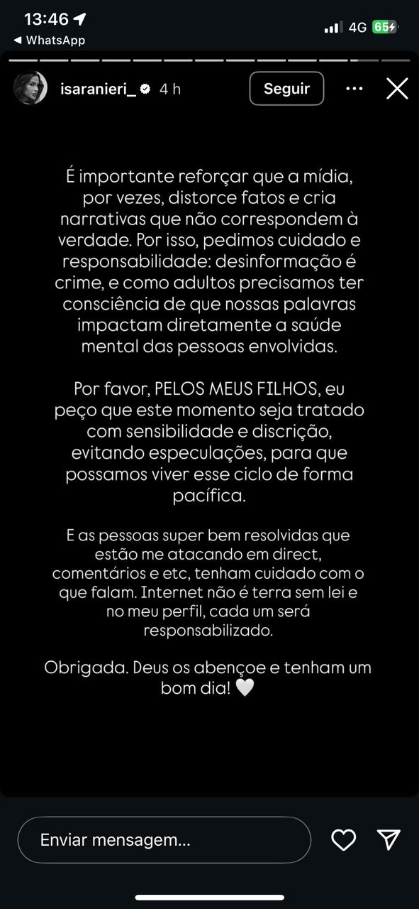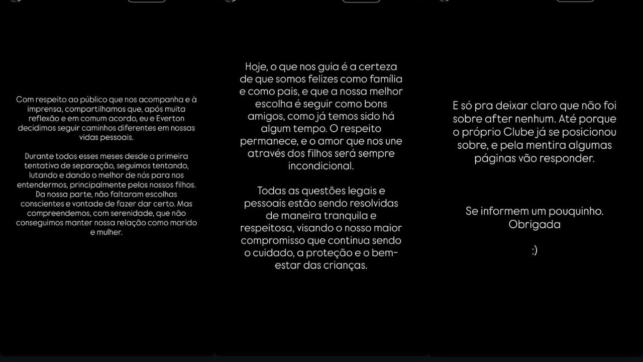 “Com respeito ao público que nos acompanha e à imprensa, compartilhamos que, após muita reflexão e em comum acordo, eu e Everton decidimos seguir caminhos diferentes em nossas vidas pessoais. Durante todos esses meses, desde a primeira tentativa de separação, seguimos tentando, lutando e dando o melhor de nós para nos entendermos, principalmente pelos nossos filhos", iniciou Isa nos Stories do Instagram.