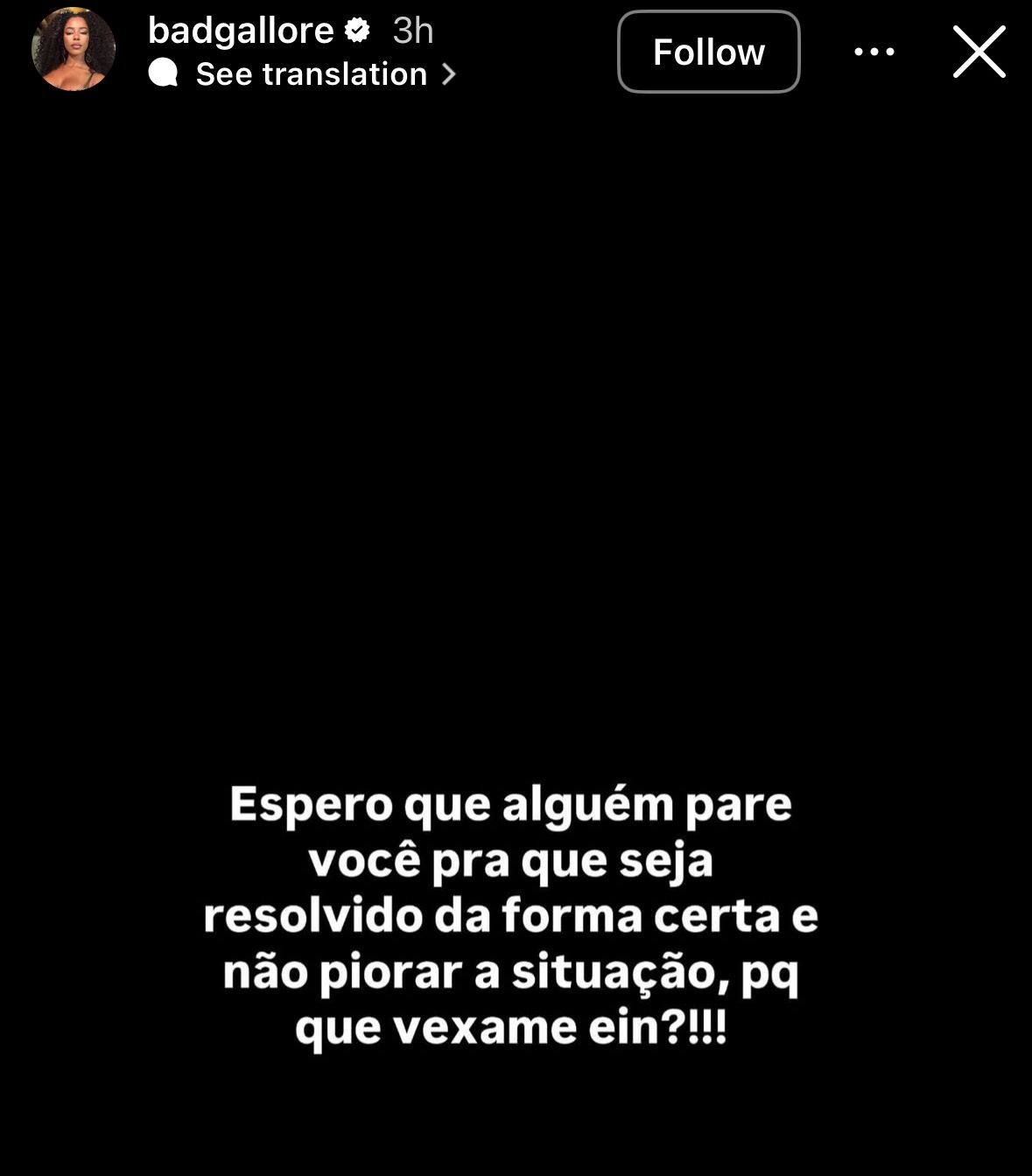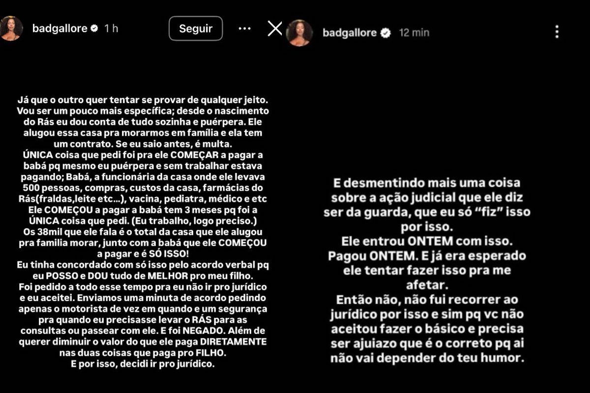 "Desde o nascimento do Rás, eu dou conta de tudo sozinha e puérpera", desabafou. Segundo a influenciadora, o cantor só teria assumido os custos da babá nos últimos três meses porque teria sido a “única” coisa que ela pediu.