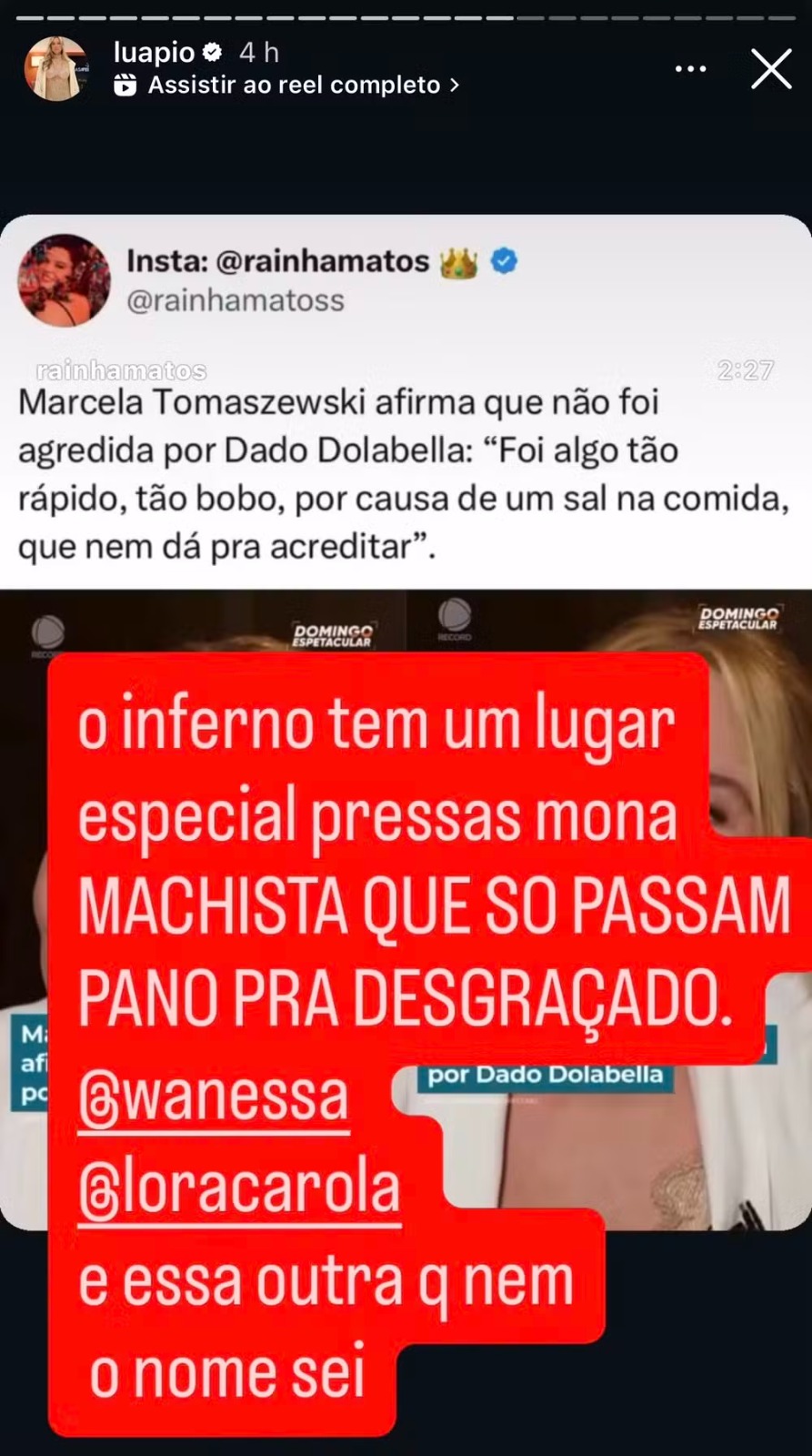 Em um Stories publicado por Piovani, ela escreveu: "O inferno tem um lugar especial para essas monas machistas que só passam pano para desgraçado. Wanessa Camargo, Carolina Dieckmann e essa outra que nem o nome sei."