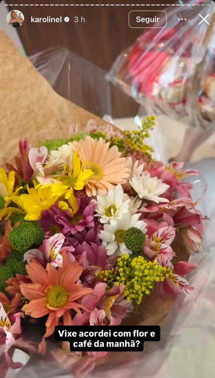 Uma semana após o término com o jogador Léo Pereira, a influenciadora Karoline Lima recebeu uma surpresa na manhã desta sexta-feira (3). Ela foi presenteada em casa com um buquê de flores e uma cesta de café da manhã recheada.