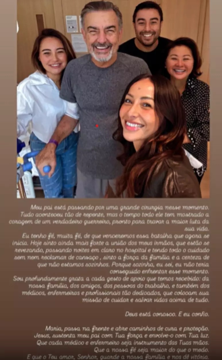 No fim de agosto, Sabrina já havia compartilhado nas redes sociais a luta do pai, em um momento no qual ele estava passando por uma cirurgia. “Meu pai está passando por uma grande cirurgia nesse momento. Tudo aconteceu tão de repente, mas o tempo todo ele tem mostrado a coragem de um verdadeiro guerreiro, pronto para travar a maior luta da sua vida. "