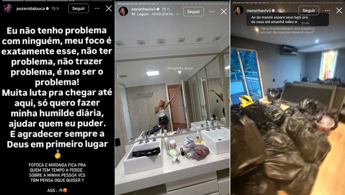 O desentendimento entre MC Poze do Rodo e Viviane Noronha ganhou mais um capítulo neste domingo (23), quando a influenciadora revelou, nas redes sociais, que foi obrigada a deixar a casa onde morava com o funkeiro. Mãe de três dos cinco filhos do artista, ela mostrou seus pertences espalhados em sacos de lixo e expôs uma mensagem enviada pelo cantor, dando um prazo para a retirada de seus bens.